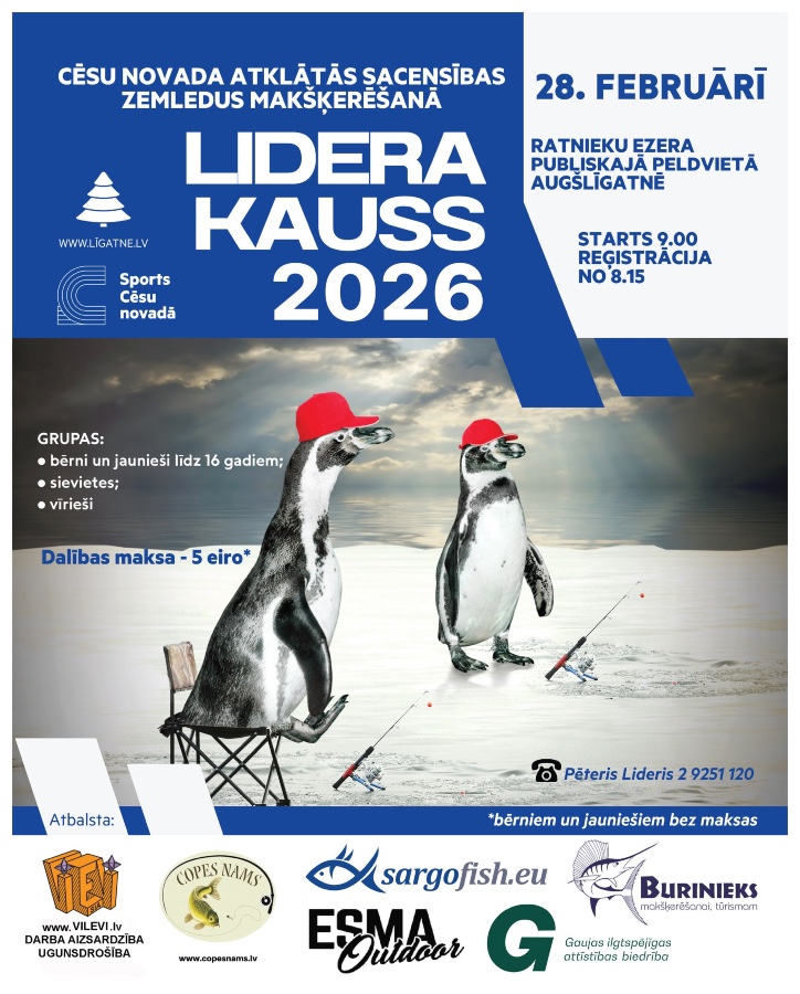 Gaujas ilgtspējīgas attīstības biedrība ziņo, ka 28. februārī Ratnieku ezera publiskajā peldvietā Augšlīgatnē notiks Cēsu novada atklātās sacensības zemledus makšķerēšanā Lidera kauss 2026. Tiem, kas dosies uz mačiem pirmo reizi, der zināt, ka ezers zivju ziņā mēdz būt cimperlīgs, bet balvas no atbalstītājiem vērtīgas un svētku noskaņa garantēta! Dalībnieki tiks iedalīti trīs grupās – vīrieši, sievietes un bērni, jaunieši vecumā līdz 16 gadiem. Dalība bērniem un jauniešiem bez maksas, bet pārējiem dalībniekiem – pieci eiro. Sacensību starts plānots plkst. 09.00, bet reģistrācija sāksies jau no plkst. 08.15.