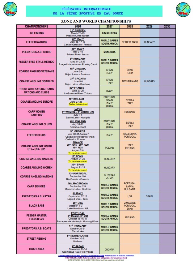 Starptautiskā Makšķerēšanas Sporta Federācija FIPSed nupat publicējusi sacensību kalendāru ar Pasaules čempionātu norises datumiem, vietām un valstīm 2026. gadam. Tā ziņo Latvijas Makšķerēšanas sporta federācija. Kalendārā arī īpašs saldais ēdiens mums! Nākamgad Latvijā Baļotes ezerā no 1. līdz 4. jūlijam vienlaicīgi norisināsies veselas divas pasaules līmeņa sacensības – sestais Pasaules Čempionāts karpu makšķerēšanā sievietēm un trešais Pasaules Čempionāts karpu makšķerēšanā jauniešiem U22. Priecājamies, ka Latvijas ūdeņiem ir dota iespēja ciemos uzņemt tik augsta līmeņa sacensības, sagaidīt labākos sportistus no daudzām valstīm. Vēlēsim mūsu dāmām un jauniešiem veiksmīgu gatavošanos un trenēšanos!