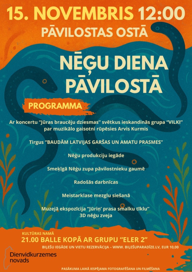 Jau septīto reizi pēc kārtas, 15. novembrī no pulksten 12.00 līdz 16.00 Pāvilosta aicina uz ikgadējo Nēģu dienu, kas kļuvusi par neatņemamu novembra tradīciju Dienvidkurzemes novadā. Svētku laikā varēs gan iegādāties, gan nogaršot gardo Sakas upes delikatesi. Būs amatnieku un mājražotāju tirgus, radošās darbnīcas, jūras velšu degustācijas, mezglu siešanas meistarklase, nēģu zupa pāvilostnieku gaumē, bet Pāvilostas muzejā varēs apskatīt 3D ekspozīciju Jūriņ’ prasa smalku tīklu. Ar koncertu Jūras braucēju dziesmas uzstāsies grupa Vilki un Arvis Kurmis, bet svētku noslēgumā Pāvilostas kultūras namā balle ar grupu ELeR 2. Ieeja ballē 10 eiro. Biļetes nopērkamas Biļešu paradīze.