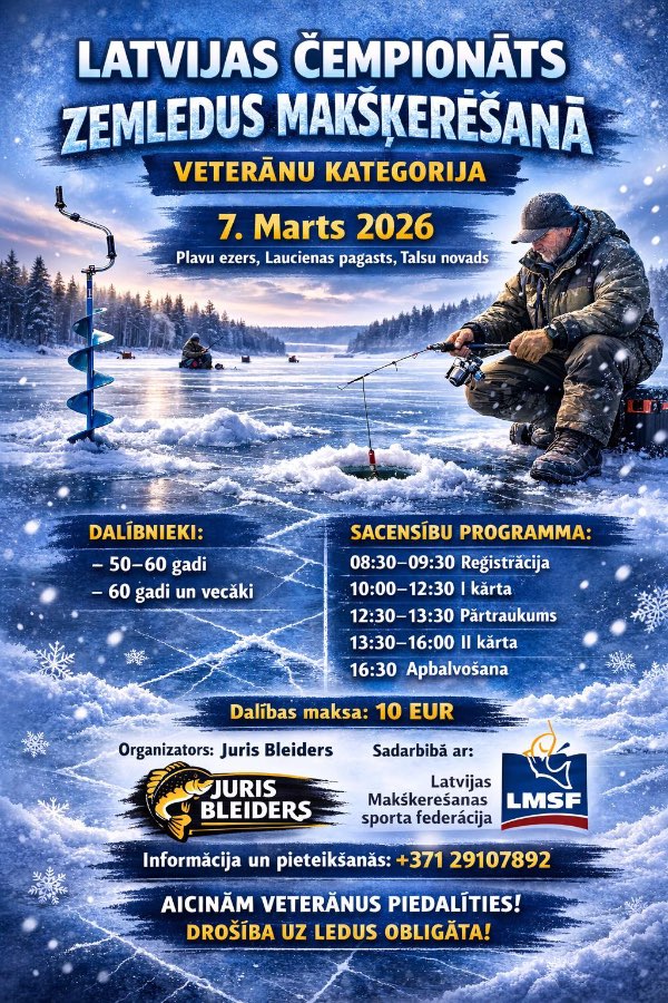 Kungi un kundzes ar pieredzi, stingru raksturu un īstu makšķernieka garu – šis ir Jūsu laiks! Latvijas Makšķerēšanas sporta federācija aicina uz lielisku pasākumu. 7. martā tiekamies uz ledus, lai noskaidrotu stiprāko Latvijas čempionātā zemledus makšķerēšanā VETERĀNIEM! Pasākums notiks Pļavu ezerā Laucienas pagastā Talsu novadā. Divas kārtas, azarts, laba kompānija un īsta sacensību garša! Ne tikai par lomiem – par satikšanos, stāstiem un īstu vīru spēku uz ledus.