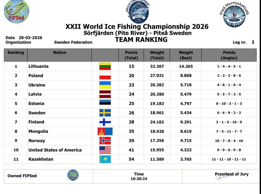 Zviedrijā pašlaik norisinās Pasaules Čempionāts zemledus makšķerēšanā, uz kuru ir devusies arī Latvijas izlase. Sacensības sākās vakar (sestdien) un tās turpināsies un noslēgsies šodien. Pēc pirmās dienas Latvijas izlase ierindojas ceturtajā vietā – tūlīt aiz Ukrainas! No trešās vietas ieguvējiem mūsu komandu šķir tikai viens punkts – tā ir divu gramu starpība! Pirmās dienas sektori bija gana sarežģīti, pirmās 40 minūtes sportistiem četros sektoros bija smagas, līdz tika piemeklēta atslēga, kas mūsu izlasi ierindoja augstajā 4. vietā. Savukārt šodien jaunas iespējas cīņai par pjedestālu! Turēsim īkšķus par mūsu sportistiem!